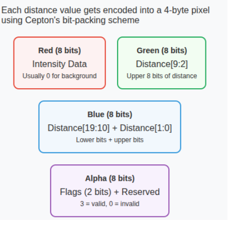You can store a lot of information in a 2d bitmap image! Each distance gets packed into a 32-bit RGBA pixel using Cepton's SDK bit-packing scheme: