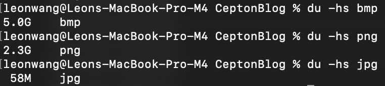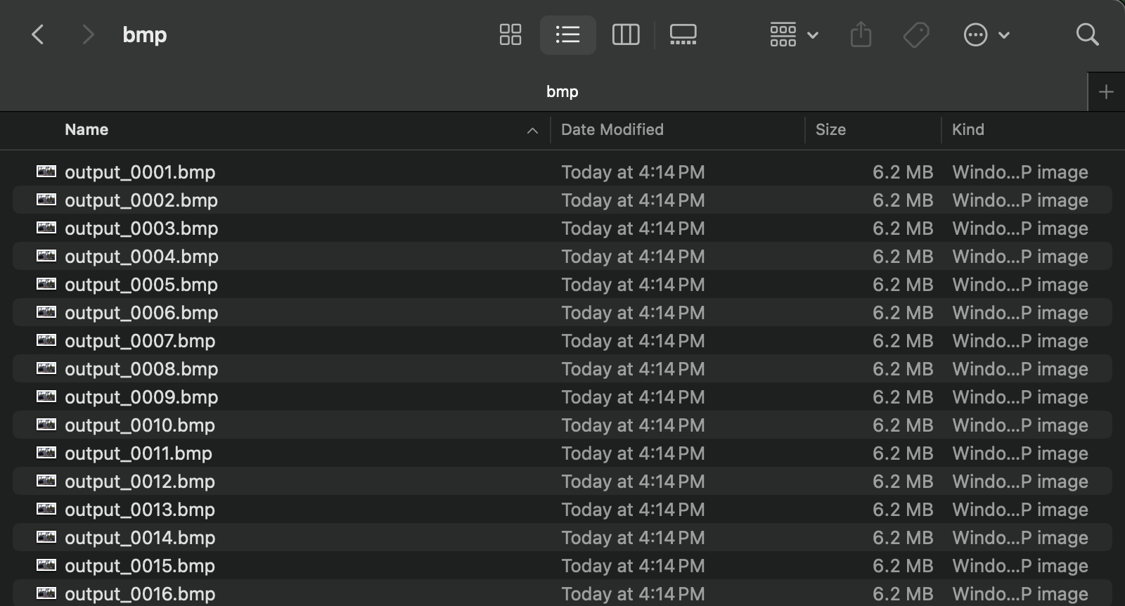 Using ffmpeg, the video is split into separate images, one for every frame. This is done three times, with the images being in the formats .bmp, .png, and .jpg. Each time, the resulting images are put in a folder named bmp, png, and jpg, respectively.