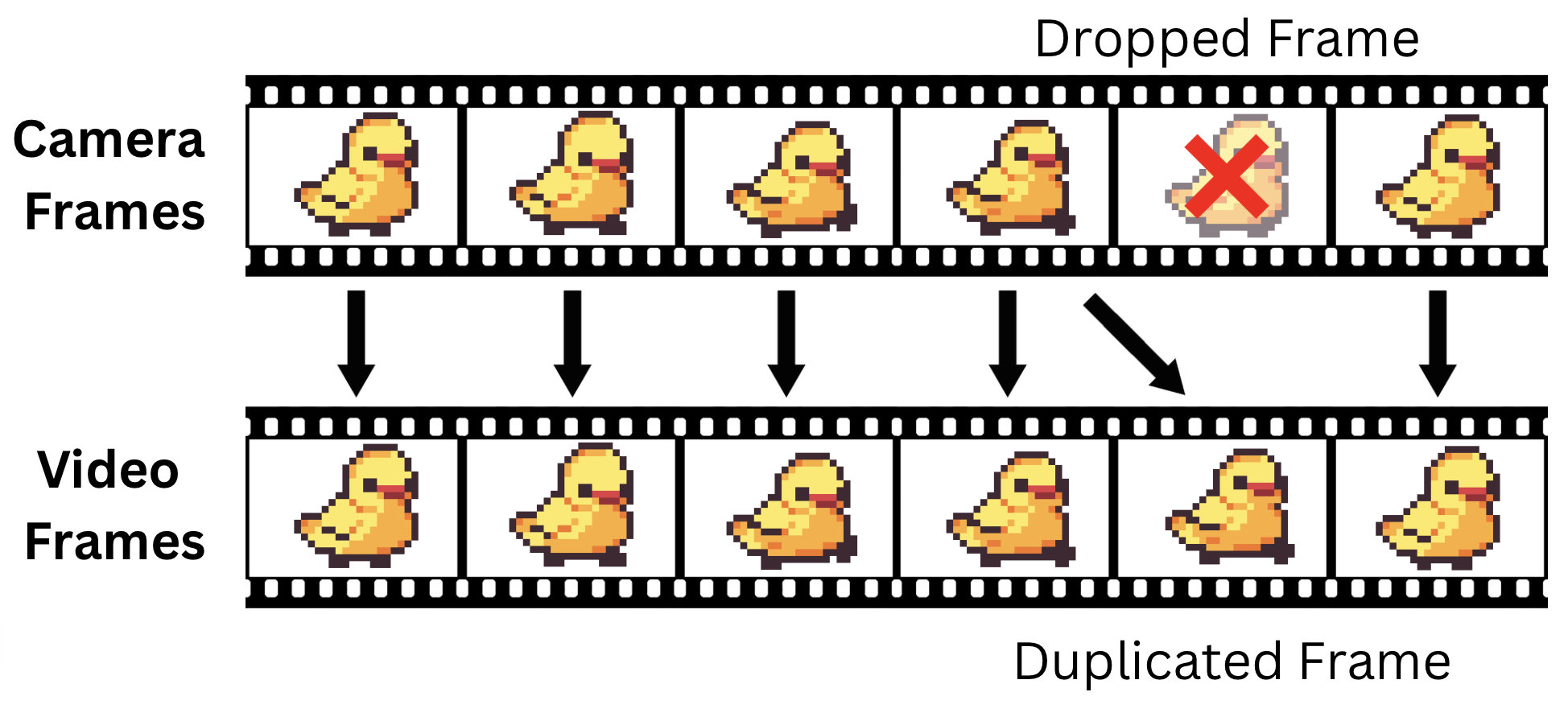 The video, however, is trickier. While videos have a constant frame rate, the actual delivery of the frames from the camera is inconsistent: Every once in a while, there will be a frame that is "dropped" (not received). Thus, we need a way to "fill" in the gaps.