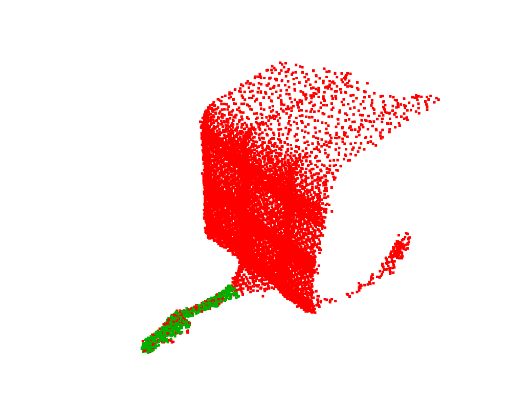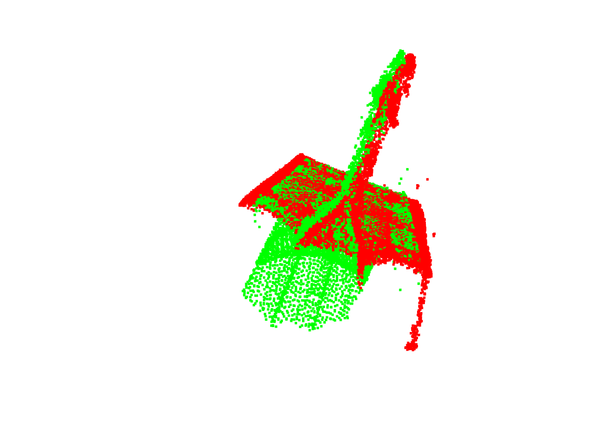 In this version, I kept track of a "source frame", this was the first frame but for each next frame, I found the transformation from the "source frame" to the next frame and applied this transformation for the "source frame". Then I also apply this transformation to the trailer tongue from the previous frame. This resolves an issue from Attempt 1 because now, an error in the ICP can be corrected in the future because this error was also applied to the "source frame", so in a future time when ICP is used to find a transformation from the source frame to a current frame, it will take into account the error earlier and adjust accordingly to that. However, there is another issue with this which is that the points for the "source frame" are points from the first frame. The trailer as scanned in the first frame may be very different from the trailer scanned in a much later frame. The image below is a bottom view of how well the source and the current frame match. The backplane for the two point clouds (in different colors) is matched well by ICP but the front tongue part is not being matched together.