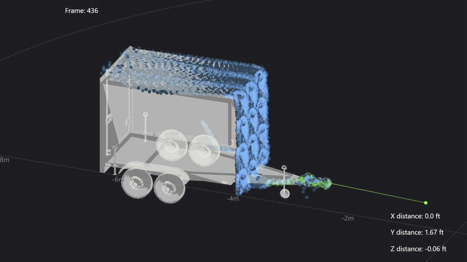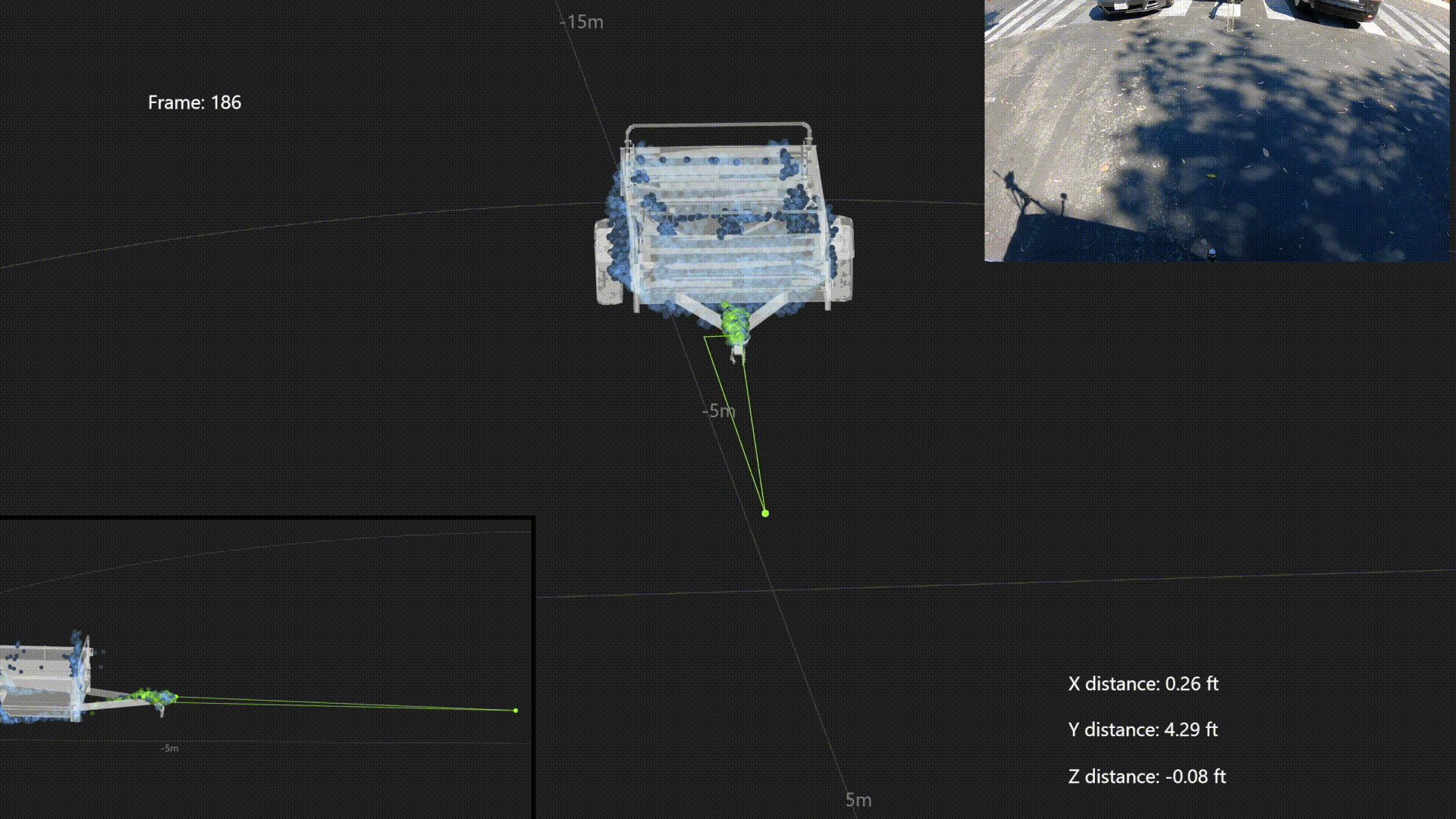 To visualize the results, I added the points which are the trailer identified and the trailer tongue identified in a different color. I also added some text that shows the distance of the trailer tip from the truck. There are also lines illustrating the distance and direction from the truck - which turn from green to red once the trailer is within a very close distance to the truck