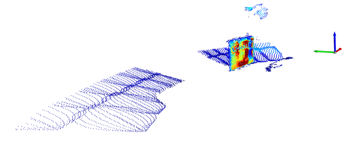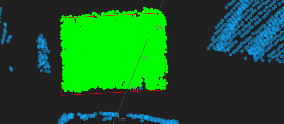 The first task was to recognize the trailer face. We cropped the point cloud to a certain distance range where the trailer was sure to be located: in this case, from 0.5 to 10 meters. Uniform gridding was also applied across all data points. This particular dataset had the following point cloud: