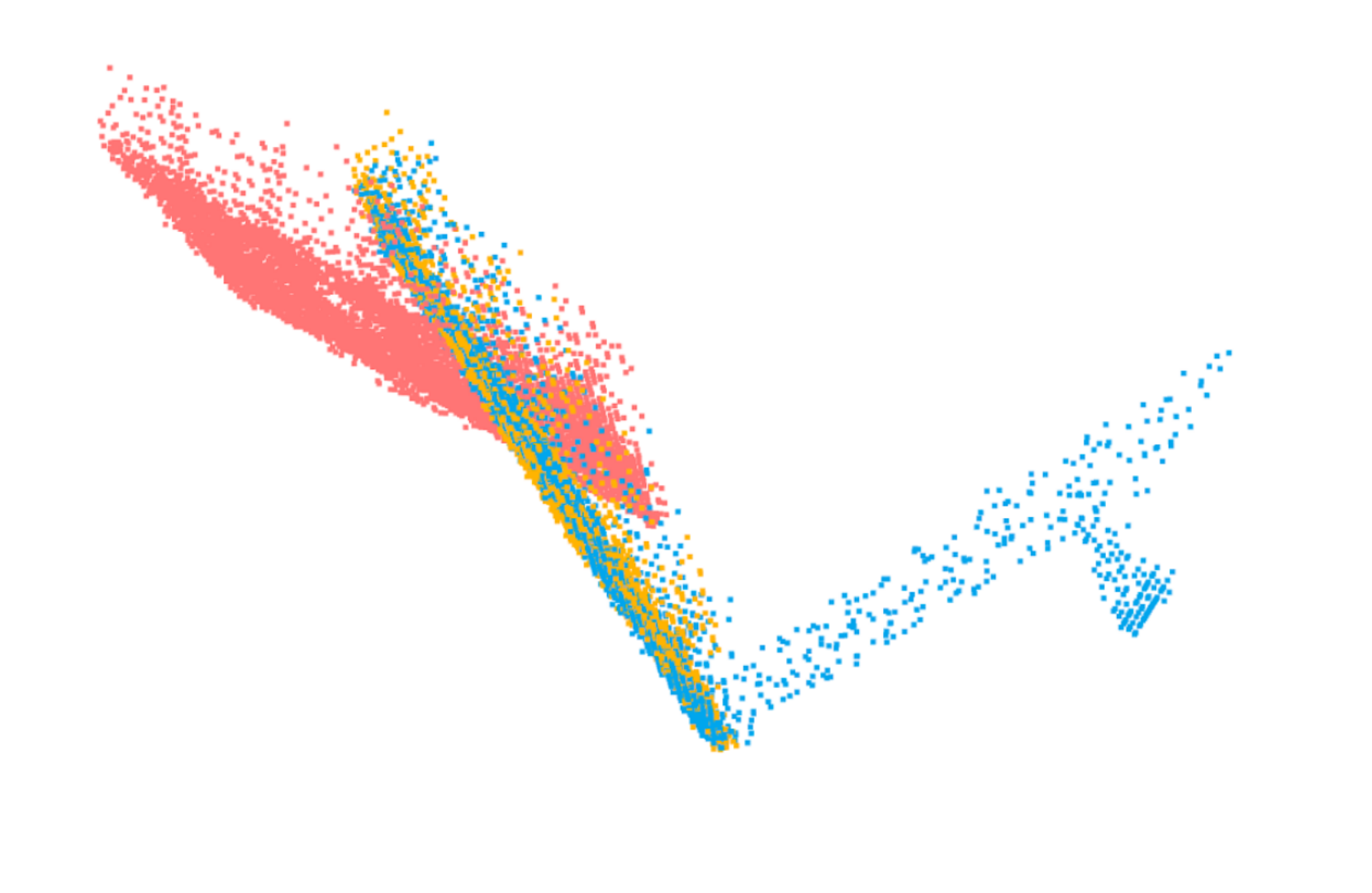 To track the angle from each frame, the ICP (Iterative Closest Point) algorithm was applied on the current frame with respect to the starting frame of the data. This returned the rotation and translation as a 4x4 transformation matrix from which we could extract the angle. The figure below demonstrates the effectiveness of the algorithm on the data. The pink points are the source, the blue points are the target, and the orange points are the source with the transformation matrix applied. The orange points were found to be 98% accurate with the blue points.