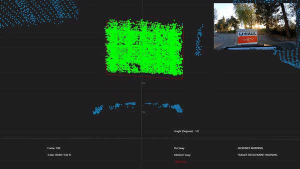 Towing a trailer and traveling high speeds can be very dangerous if the driver is unaware of the trailer’s condition. This project implements a detection and tracking algorithm in the point cloud to monitor the angles of a towed trailer using Cepton’s LiDAR sensors. Trailer detection is used to alert the driver of the jackknifing or trailer detachment risks, and angle tracking is used to alert the driver of the trailer’s sway. These features would help decrease the risk of an accident.