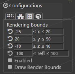 The third tab in the Configuration Menu is the Configurations Bounds Menu. Here you can adjust the limits along x, y and z directions, as well as the reflectivity to render a specified area of the point cloud.