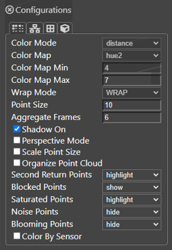 | Color Mode | Change the colorization of the point cloud by Z, Y, Distance, Reflectivity, or Channel. |