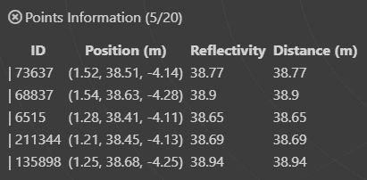 Use the Point Selector tool to recieve ID, position in x, y, and z values, reflectivity, and distance data for a specific point in the point cloud. The measurement of position and distance is in meters. Reflectivity is displayed as a percentage. The Point Selector will only display reflectivity values when color mode is set to reflectivity in the PCL tab of the Configurations menu. Please note that the Point Selector is only available in paused PCAP recordings and when the Ruler Tool is toggled off. To use the Point Selector, hold Shift and use the left mouse button to click on the point you are interested in. Below is an example of what the Points Information window will look like.