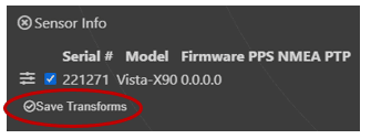 Use the transforms window to adjust and align multiple sensors. Your custom configuration can be saved for other applications by clicking the Save Transforms button in the Sensor Info Window. Use File - Load Transforms to access your saved transforms.